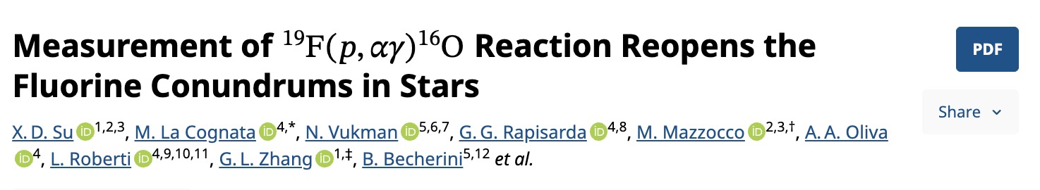 北航新闻网11月3日电(通讯员 周小朋)近日,北京航空航天大学物理学院张高龙教授与意大利合作者在19F(p,αγ)16O 天体物理反应率研究方面取得重要进展。该研究采用特洛伊木马间接测量方法,首次成功提取了11千电子伏共振峰的共振强度,并获得较以往研究显著偏低的反应率。相关研究成果已于10月29日被物理学期刊《Physical Review Letters》在线发表,文章标题为《Measurement of 19F(p, αγ)16O reaction reopens the fluorine conundrums in stars》。这一新结果对当前氟元素丰度预测提出了挑战,重新引发了对该领域尚未解决的钙丰度关键科学问题的关注。北京航空航天大学2025届博士毕业生苏学斗(现任职于中国科学院上海应用物理研究所)为第一作者,北京航空航天大学张高龙教授、意大利南方国家实验室INFN-LNSMarco La Cognata 教授、意大利帕多瓦大学Marco Mazzocco 教授为通讯作者。